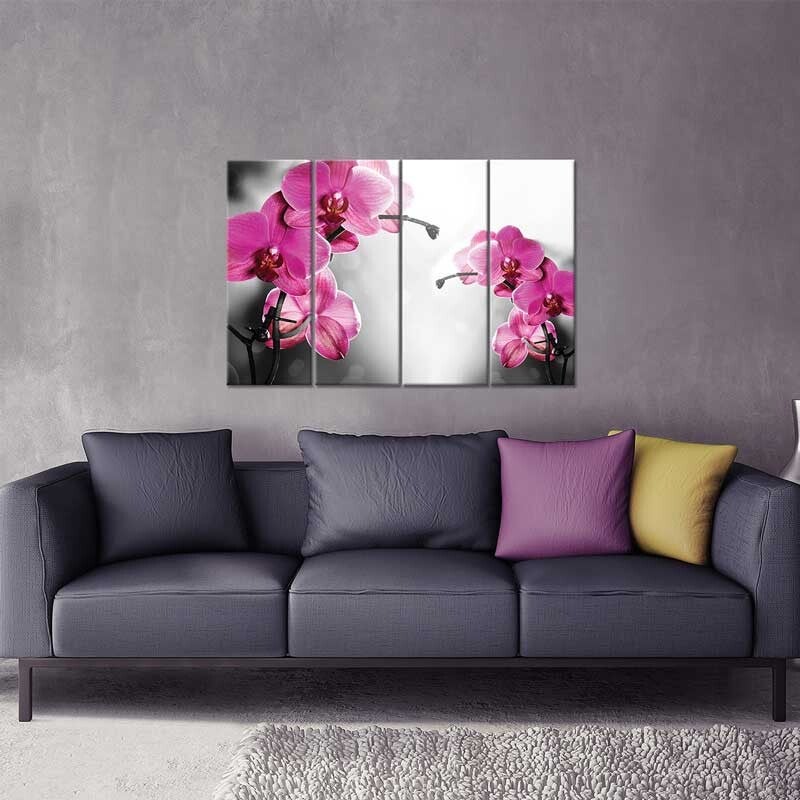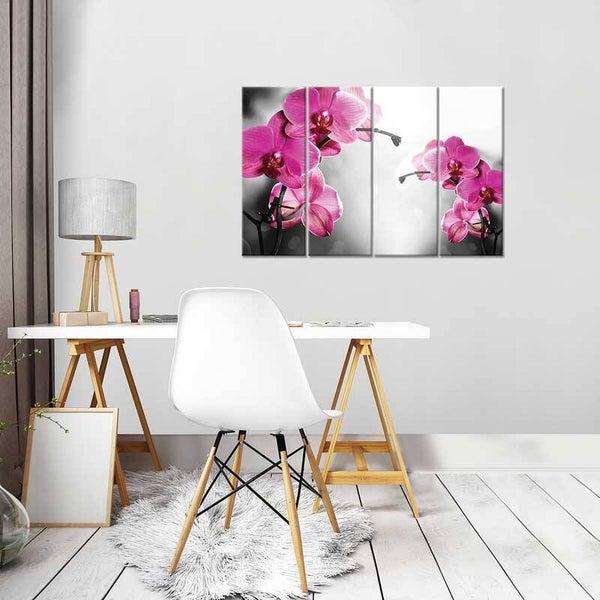 De canvas schilderij set, bestaande uit een combinatie van vier schilderijen met roze orchideeën is een echte blikvanger in de woonkamer, slaapkamer, kantoor of iedere andere ruimte.