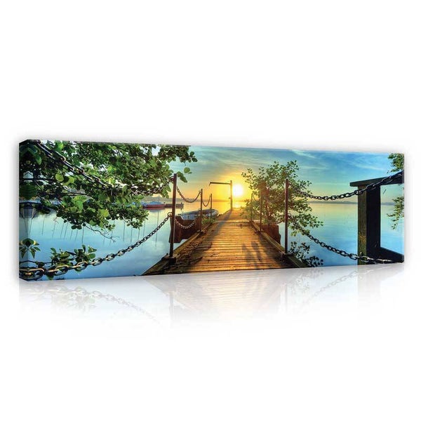 Geniet van de adembenemende zonsondergang boven meer met ons schilderij steiger zonsondergang. Het schilderij toont een houten steiger met een bootje in het meer in de avond.