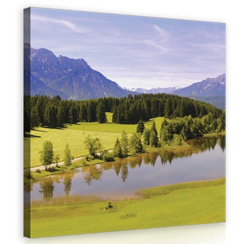 Verfraai uw interieur met ons betoverende berglandschap schilderij. Het schilderij toont de majestueuze bergen met een rustig meer, wat zorgt voor een gevoel van rust.