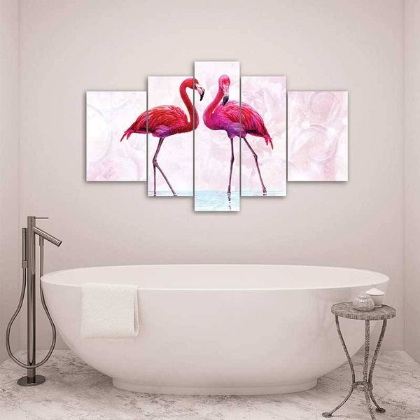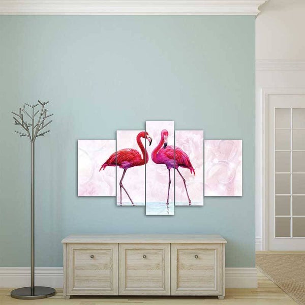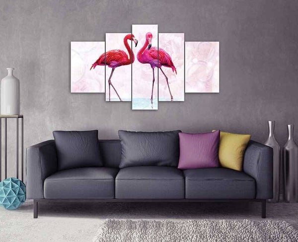 Breng de pracht en gratie van de flamingo's in uw interieur met ons adembenemende 5-luik flamingo schilderij. Dit meesterwerk vangt het betoverende schouwspel van twee elegante flamingo's, gepresenteerd in een artistiek samenspel van vijf individuele schilderijen.