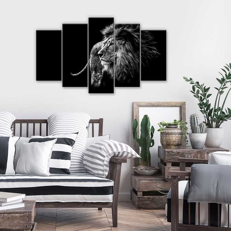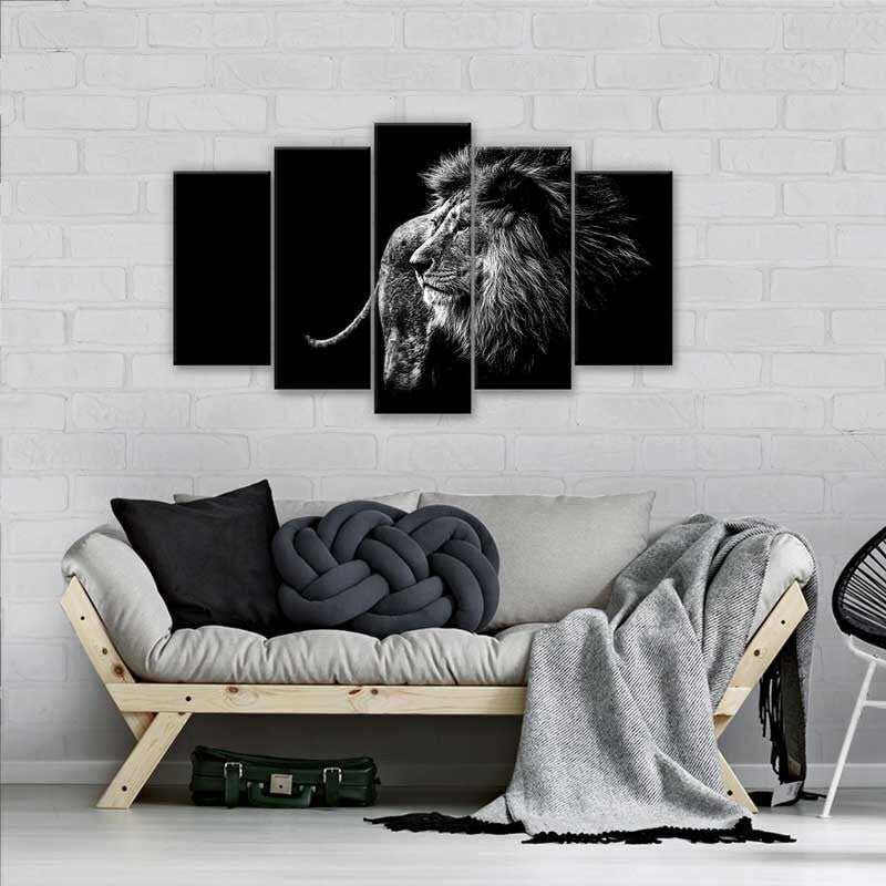 Ervaar de majestueuze kracht van de leeuw met onze adembenemende vijfluik schilderij met daarop een prachtige leeuw. De schilderij set neemt u mee naar de wilde Afrikaanse savanne, waar een imposante leeuw in al zijn glorie schittert tegen een diepzwarte achtergrond.