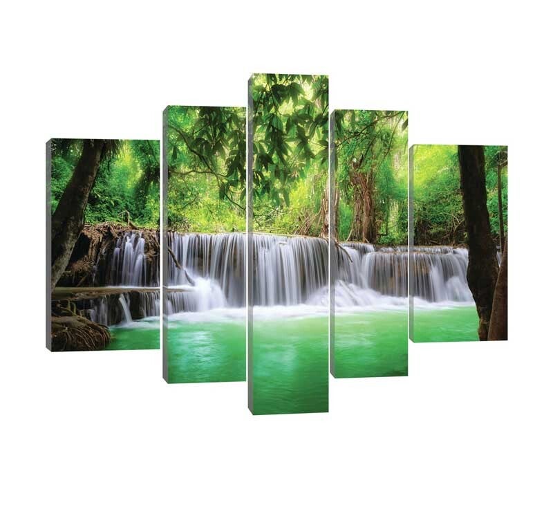 Beleef de ongerepte schoonheid van de natuur met onze prachtige 5-luik schilderij van een waterval in de jungle. De schilderij set neemt u mee op een betoverende reis naar een weelderige oase waar het geluid van stromend water en de weelderige groene omgeving uw zintuigen prikkelen.